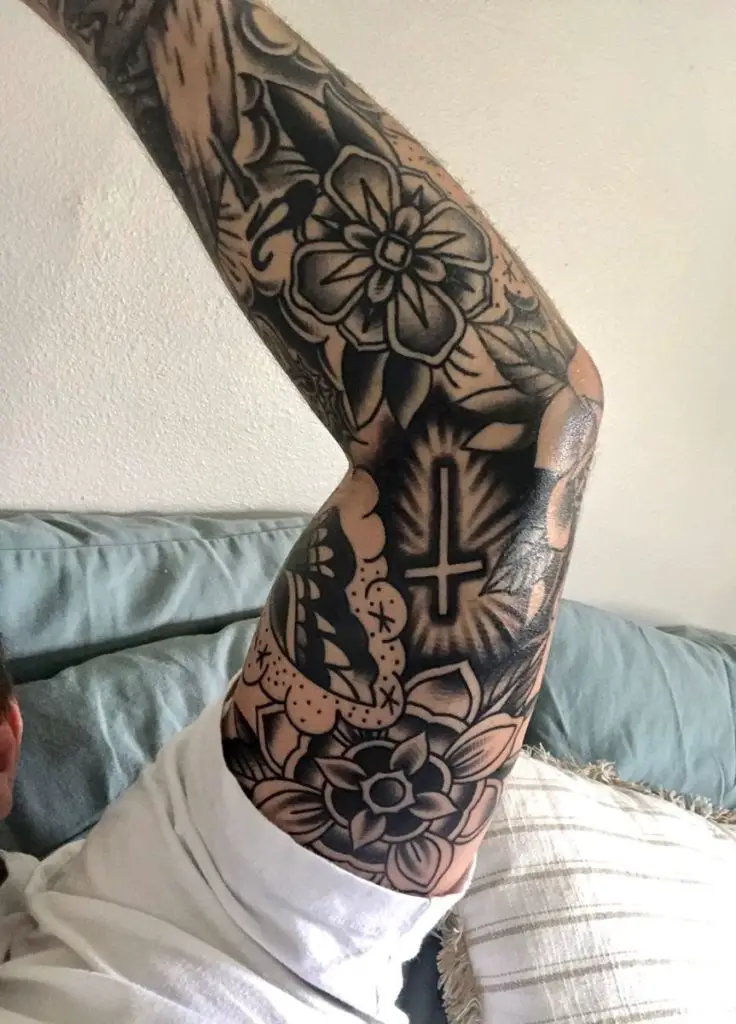 This tattoo sleeve is intense and unapologetically bold. The blackout shading on florals is highly visual, and the upside-down cross strikes an attention. It is a perfect style of a person who wants to make use of the use of backgrounds in shading to create a heaviness and a contrast. This kind of design works best for men’s sleeves that rely on power and presence rather than color — a great example of how filler can define a whole vibe.