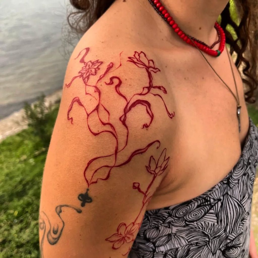 This striking sleeve uses red ink to sketch abstract, dancing vine forms and blooming flowers. The suggestive filling nature allows the free-flowing positioning of filler to add movement between supplied pieces or it can also be used as a frame to improvise over. The red hue gives it a modern, edgy twist — perfect for women’s sleeves that want a balance of greenery and visual attitude without heavy shading or outlines.