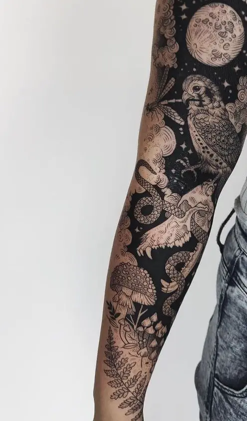A dramatic example of backgrounds shading done to perfection, this tattoo sleeve creates an entire enchanted forest narrative. All the elements such as the moon, owl, snake, and the mushrooms sit well with a sea of bold black inking of high contrasts in each detail. Ideal for both men and women, this sleeve filler is a storytelling element in itself — great for those who love botanical, animal, or even harry potter-like mystical themes.