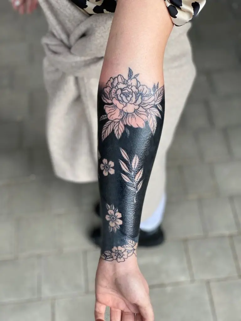 Using full blackout sections to frame untouched floral designs, this tattoo transforms negative space into high-impact backgrounds. The other petals are neat, concise and the entire piece appears modern and bold. Ideal in case you are a guy or a girl that prefers to cut through various devices in in a sleeve but still have the design be extravagant. This filler idea adds contrast and structure without extra visual clutter.