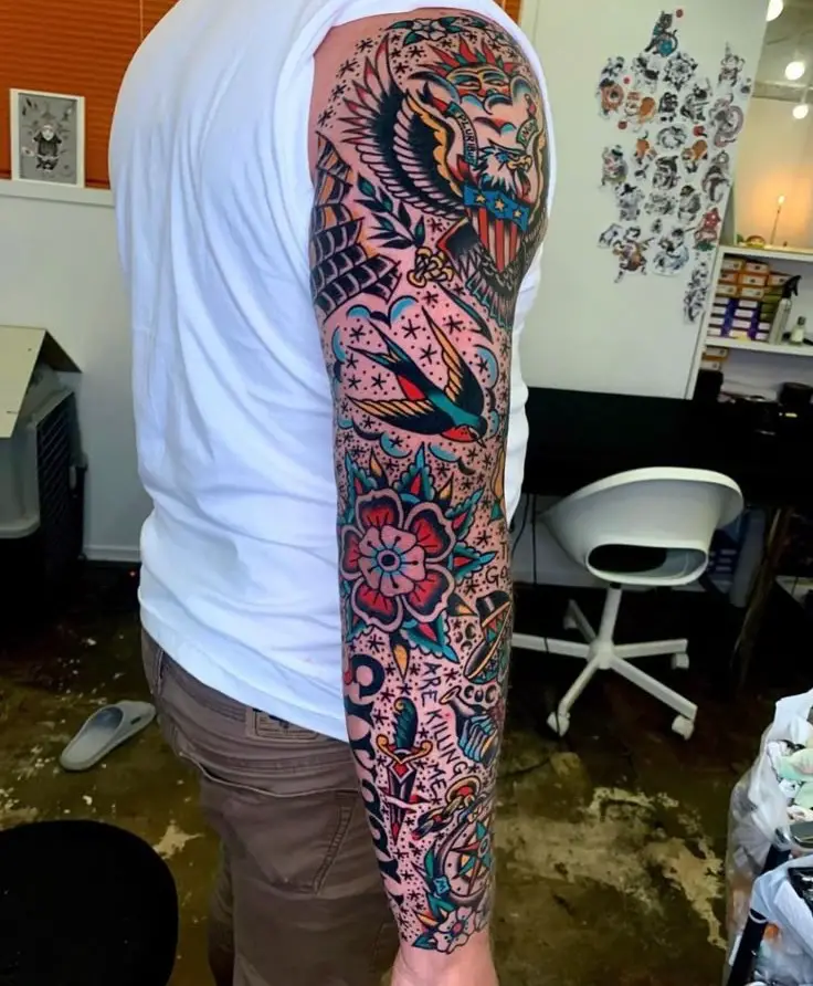 Classic traditional tattoos like ships, dice, and butterflies are arranged in a tight sleeve layout, but what really ties them together are the starburst fillers. This combination of mini sparkle and dots makes natural flow and rhythm throughout all sleeve. It is an amazing style that men can use when they need a harmonious layout without the use of huge filler panels. This sleeve shows how strategic backgrounds can elevate timeless motifs.