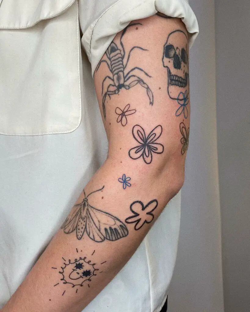 This sleeve filler concept leans into simplicity: loose line flowers, moths, skulls, and minimal outlines. The tattoo gaps turn out to be equally important as the tattoo itself. Using these hand-drawn designs as backgrounds or light patchwork is an ideal strategy for creating a casual, spontaneous sleeve — great for both men and women who prefer an understated yet cool approach.