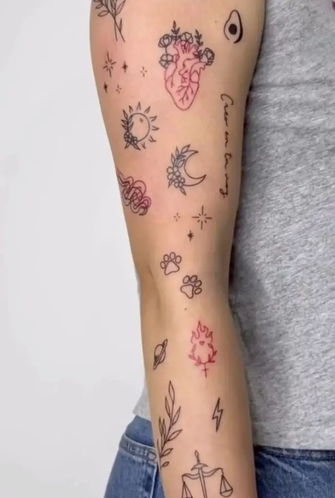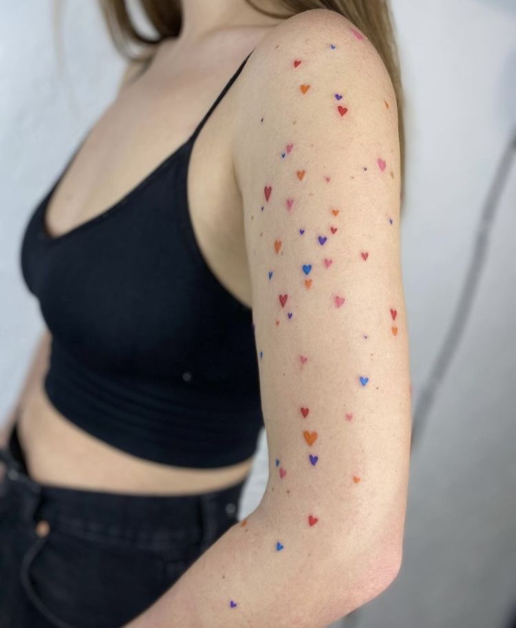 If you’re searching for light, feminine backgrounds women options, this scatter of pastel hearts offers a fresh take. These micro-sized hearts, which are in different colors, red, purple, orange and blue, add life and fun into the negative spaces, but they do not give a burden to the arm. This style is the best tattoo sleeve filler for women and it can also be done together with patchwork or sparkles. It’s minimalist, yet visually engaging—an ideal choice for those who love color but prefer softer outlines and designs.