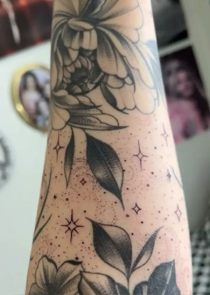 Here, soft backgrounds shading blends seamlessly into large, bold floral tattoos. Hanging and spinning around the petals are the hand-draw sparkles and the small stars, producing a kind-of magical and atmospheric filler space. It is an intelligent way amongst men and women in order to add to the already existing work in floral without over stuffing the arm. It’s clean, elegant, and creates breathing room between tattoos.