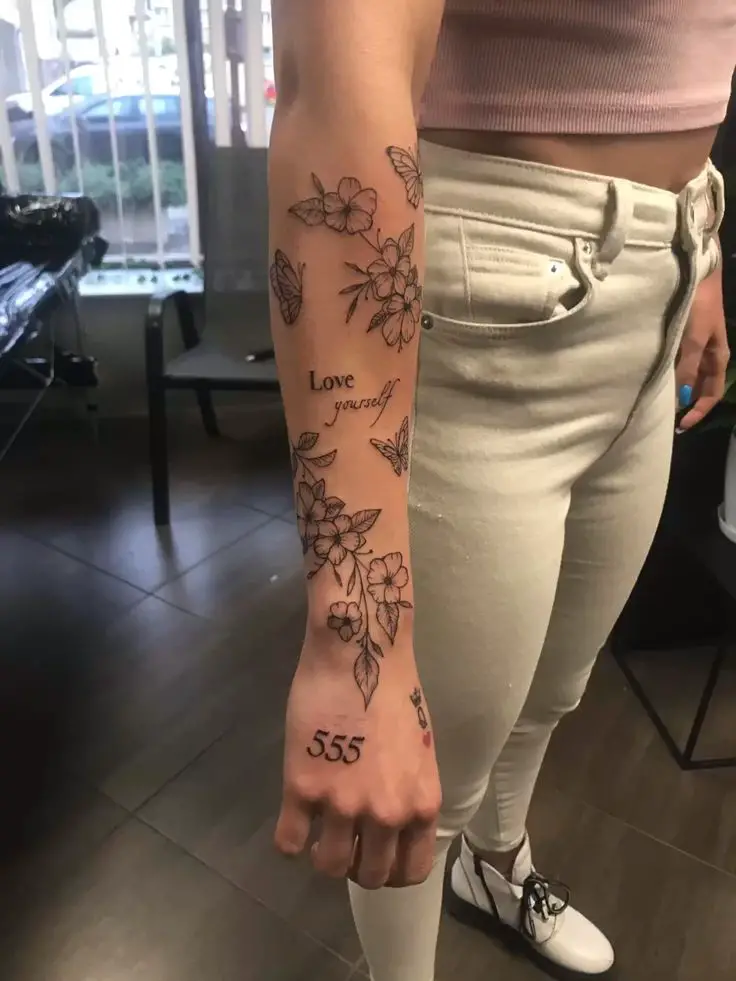 A poetic design that blends floral elements with elegant script, butterflies, and scattered stars. The hand-poked or fine line style is not only suitable to fill in some extra lines between the bigger tattoos because it is also suitable to create a female sleeve with an empowering or reflective quality. It’s a beautiful choice for those who want to integrate flowers, tiny sparkles, and words in a way that feels open and emotionally rich.