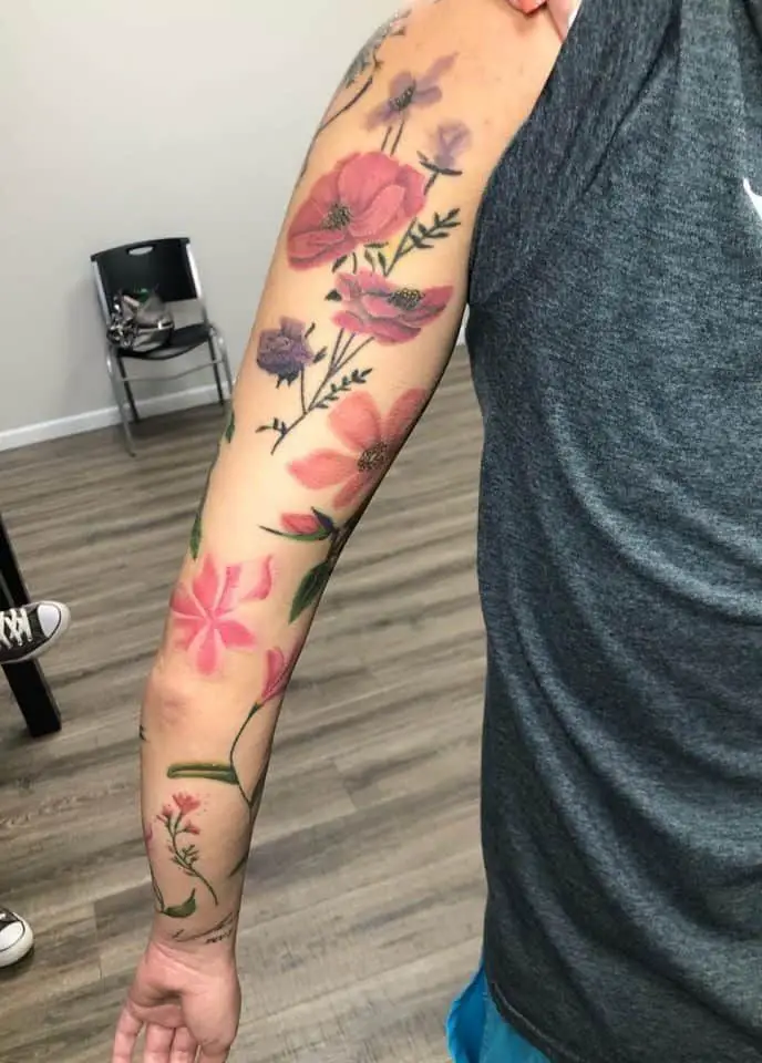 Tiny colorful blooms are scattered organically across the shoulder and upper arm, making this one of the best examples of backgrounds color used as filler. These small tattoos serve subtle transitions of larger ones or serve as gentle lines to more prominent tattoos. They’re subtle, feminine, and dreamy — perfect for women’s sleeves with a botanical, girly, or even Western springtime theme.