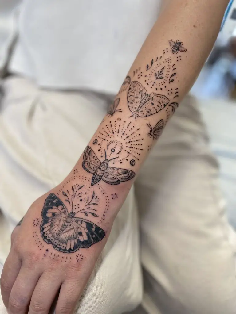 For those seeking tattoo sleeve filler ideas for men or women’s minimalist designs, this black-and-grey insect sleeve offers a mystical aesthetic. Jubilant dotwork all around the moths, butterflies and bees adds some heavenly power to the work. This kind of fillers are excellent to interrupt more serious work or ease a transition into bold works. Pair it with backgrounds cloud, sparkle, or traditional motifs to deepen the story and keep the balance strong across your sleeve.