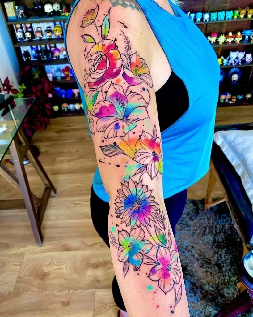 A vibrant floral sleeve like this is a brilliant example of how backgrounds color and rich pigment work together to fill a sleeve beautifully. The dreaminess in the background watercolor made look of each flower is close to ethereal, the effect serves exactly those who are in need of girly, yet creative women ideas. There is deliberate splashing of blue, pink, and orange on roses, lilies, and daisies so that it may be categorized as one of the best tattoo sleeve filler ideas known to those who adore bold feminine expression. Add subtle greenery or extend with soft backgrounds cloud elements to transition into existing ink.