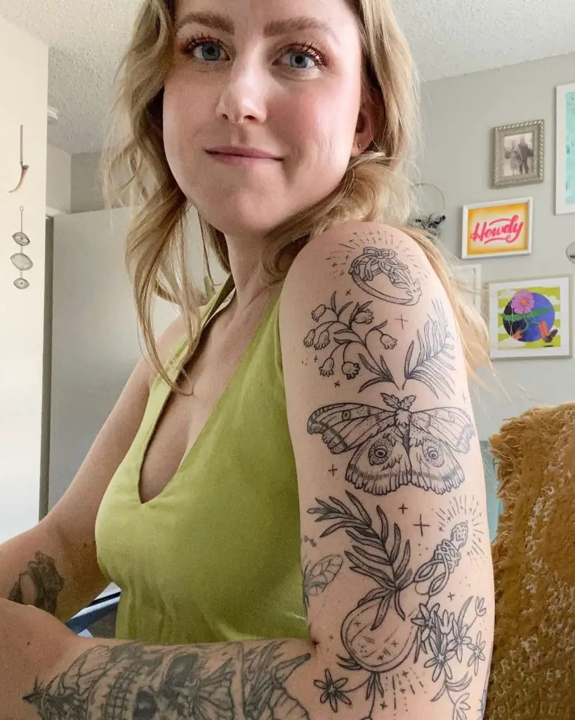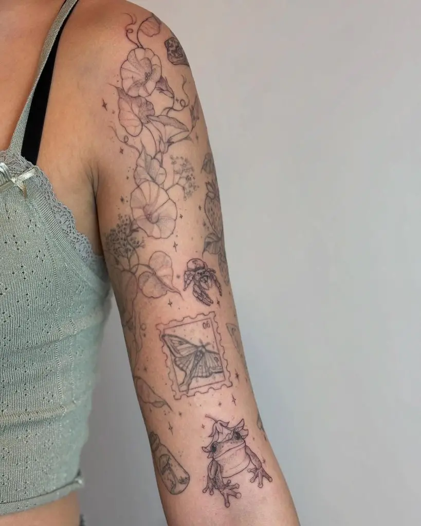 This tattoo sleeve blends delicate botanical illustrations with nostalgic objects—like a frog in a wizard hat, vintage stamps, and potion bottles. The light-hearted theme bears the Harry Potter element with a sense of nature. Each filler is able to breathe due to lack of hefty backgrounds especially when they come with minimal filigree or floral trimming. These kind of filler ideas on sleeve fillers on women are understated, oddball and have tales to tell. A clever use of fine lines makes it easy to expand later with additional sparkle or vine patterns.