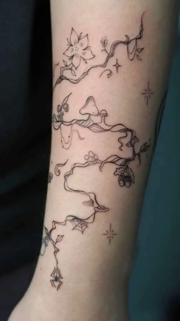 This design takes a whimsical approach with thin, winding vine lines crawling down the arm, connecting mushrooms, acorns, leaves, and tiny flowers. It is perfect when you love nature or a person with a smaller image on the sleeve. You can think of this filler design as the sort of thing that will serve well as backgrounds of women drawing on fantasy elements mixed with fine line botanical elements. You could even weave it through existing pieces or between themes in a patchwork sleeve.
