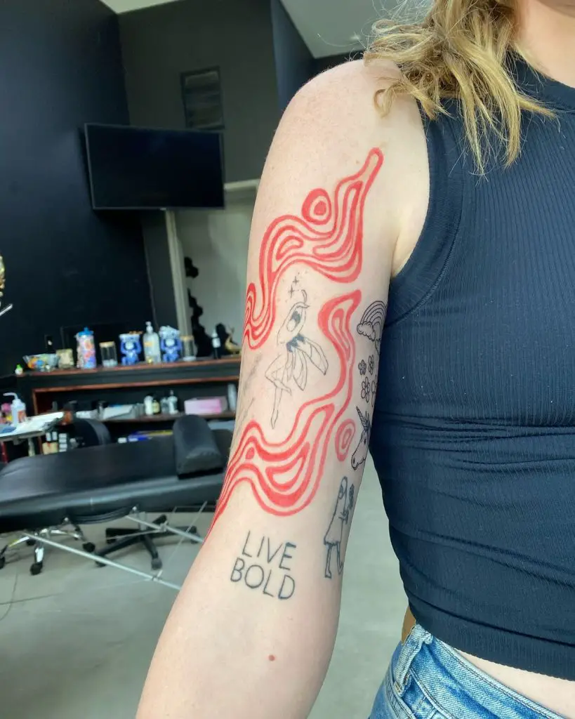 This creative filler wraps the arm in bold red ink that mimics flowing flames or psychedelic waves. The background features a plethora of red which makes the rest of the black ink tattoos stand out, and provide the sleeve life and movement. This idea is ideal in creating a Western influenced or contemporary kind of patchwork sleeve: no full coverage is required. A great idea for men or women seeking high-contrast tattoo designs in 2025.