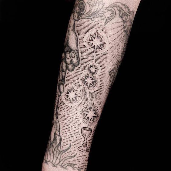 A sequence of bright stars forms a symbolic constellation, anchored by spiritual imagery like a chalice and divine feet. The background soft shading plays a special role, making this filler emotionally deep and with a celestial appeal at the same time. This design suits very well to harry potter inspired people, astrology or alchemy. It brings sparkle and meaning to the sleeve — especially suited to those looking for metaphysical backgrounds ideas.