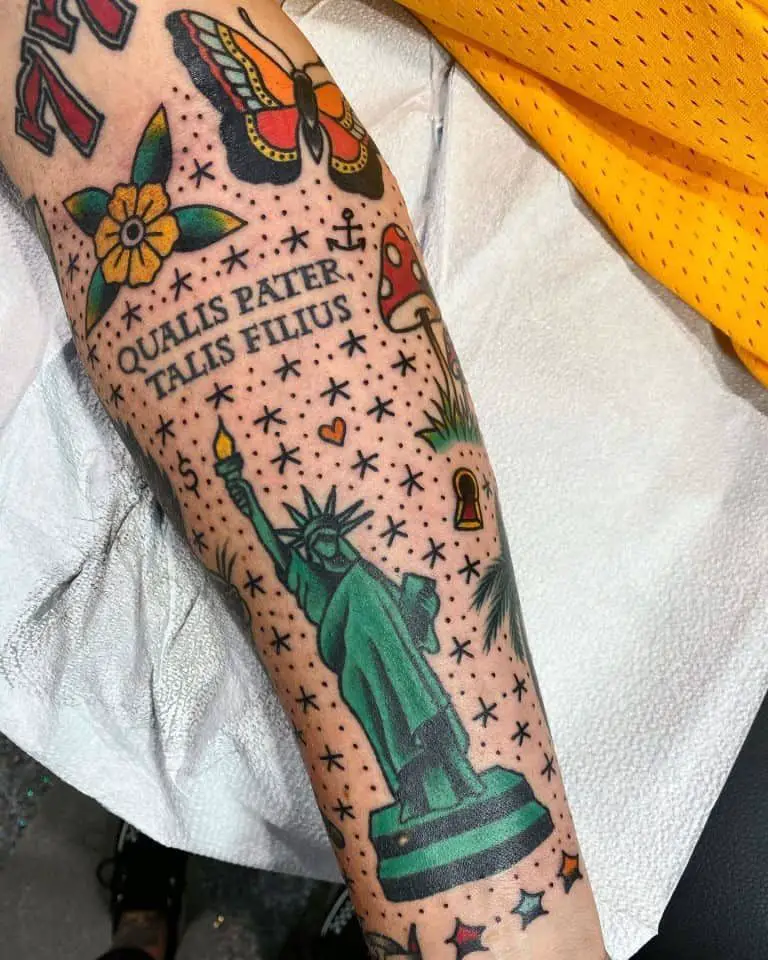 The bold Statue of Liberty, mushrooms, butterflies, and stars pop with saturated color and playful energy. On this sleeve stars and mini dot shading have been utilized in a clever way as backgrounds in honey comb style filler. This style is ideal with a patchwork design on men and the combination of brightness and strategic space helps create a balance. It’s fun, nostalgic, and visually engaging — an excellent direction for those who want each tattoo to tell a separate story.