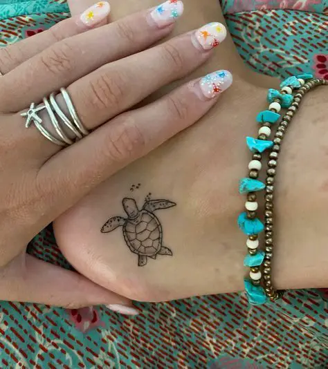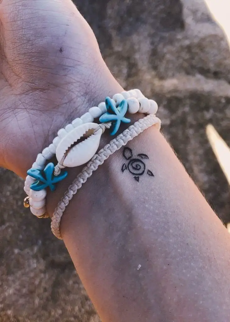 This delicate inner wrist tattoo features a fine line turtle design with a tribal spiral shell pattern — symbolizing peace and endurance. The location is perfect to people, who desire a less conspicuous, though significant tattoo with a touch of the ocean. Paired with beachy shell bracelets, it’s a nod to island life and perfect for free spirits.