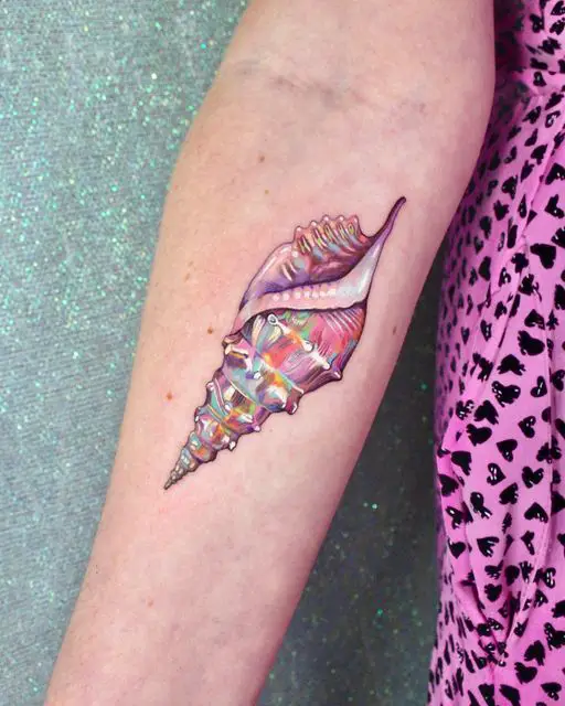 Glowing with iridescent pinks and purples, this hyper-realistic seashell tattoo pops off the skin like a 3D sticker. Its metallic finish is a colorful realism tutorial, so it will be best suited to those who seek forearm jewelry. It’s bold, magical, and impossible to ignore — ideal for women who love the spotlight.