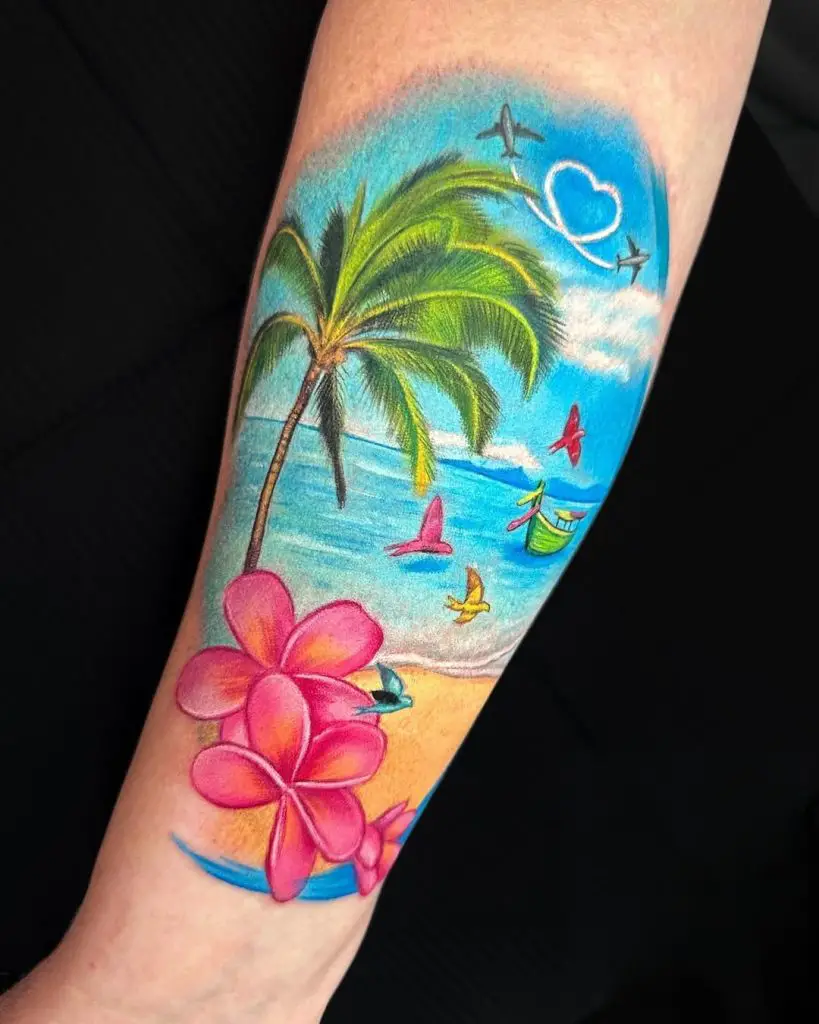 This large sleeve color tattoo bursts with tropical joy — pink plumeria blossoms, a waving palm tree, and colorful birds flying across a bright sky. Two planes leave a trail of a heart shaped cloud behind them setting an air of whimsy. This forearm piece is bold, playful, and ideal for women who want their ocean memories inked in full color.
