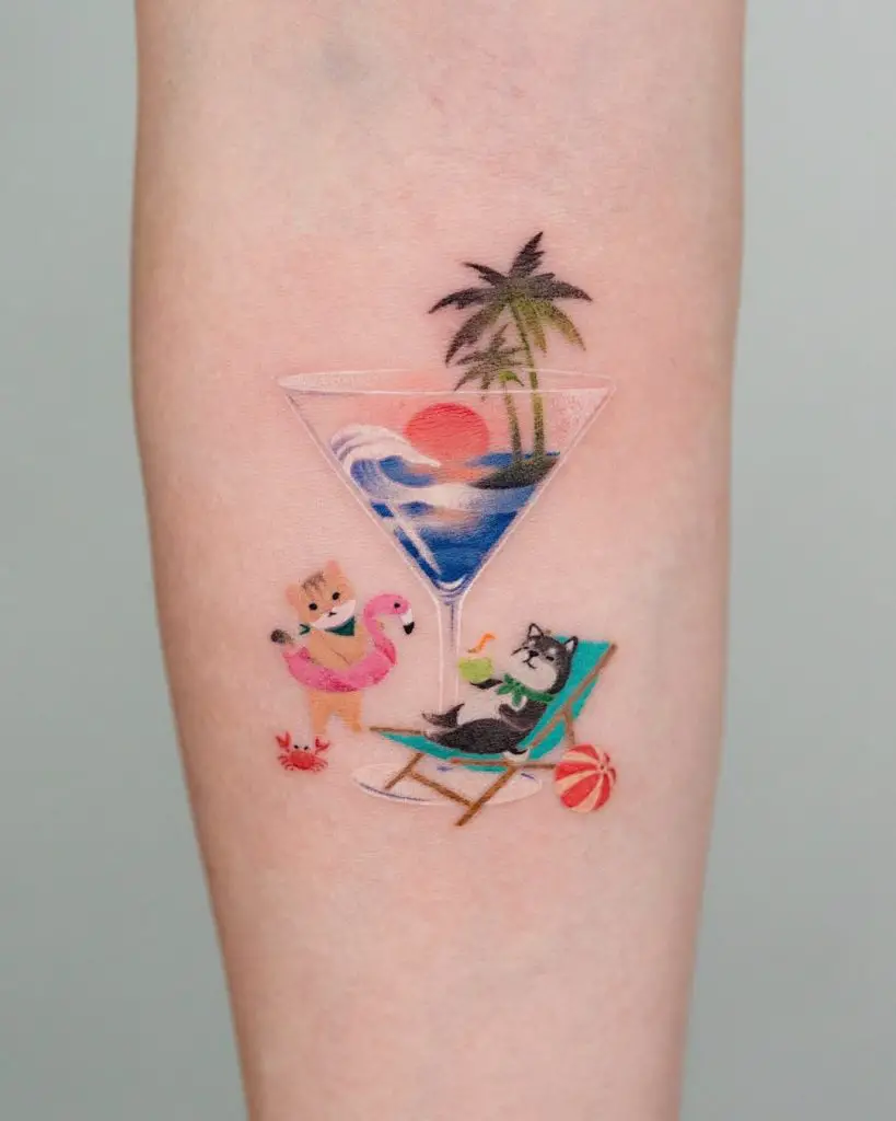 Cute meets creativity in this tiny scene: a martini glass filled with waves and a sunset, surrounded by cartoon cats in floaties and a sun lounger. This micro tattoo mixes fun and beachy atmosphere in unusual layout. It’s a forearm-friendly piece for women who love quirky beach moments with a tropical twist.