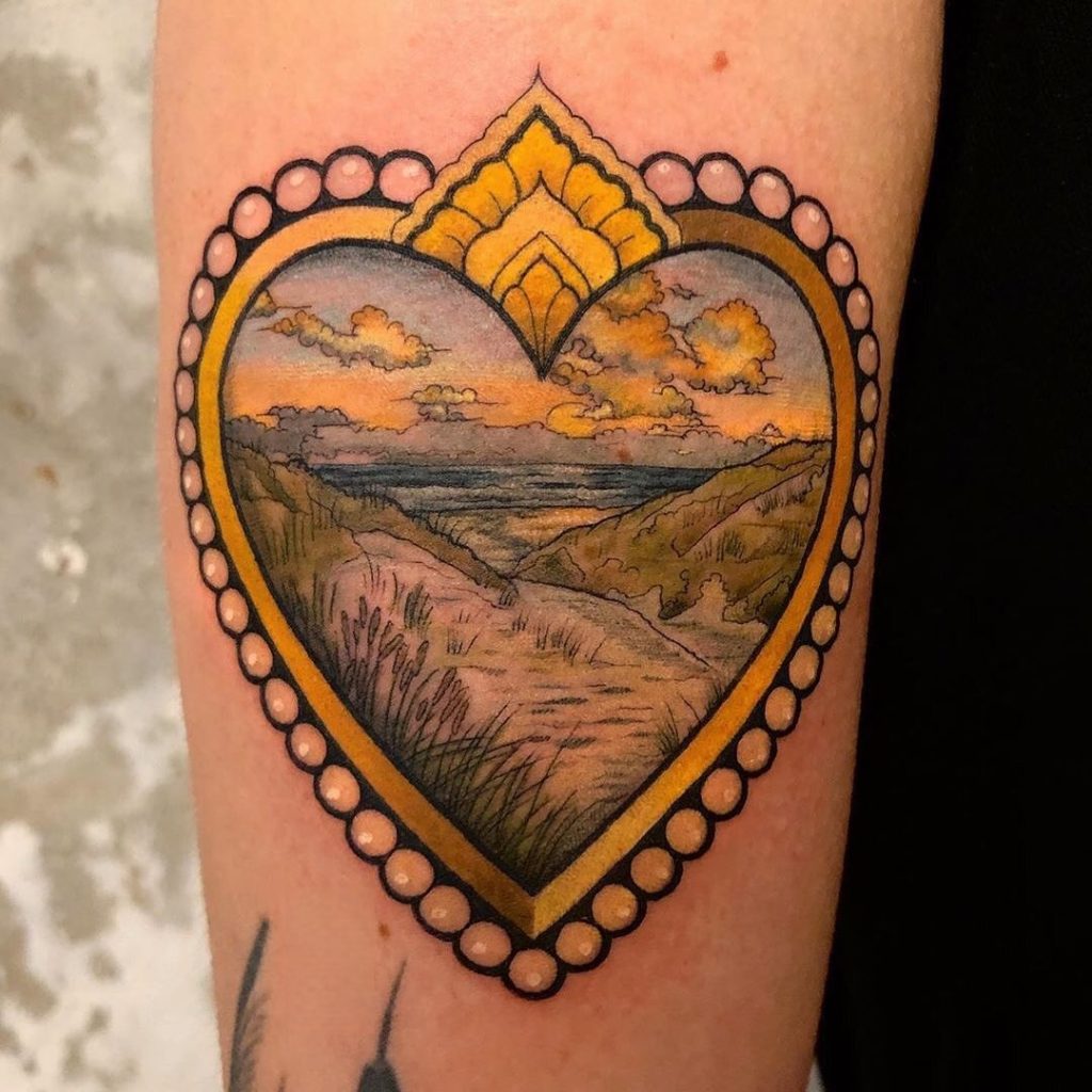 This heart-shaped frame captures a detailed beautiful sunset view over rolling hills and a distant sea. It has a beautiful vintagey border with golden clouds and it reminds me of a nice walk through the beach and the placid endings. A wonderful option for a thigh or shoulder tattoo with romantic depth and unique linework.