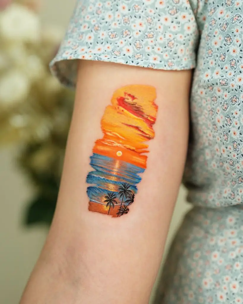 Rendered like a brushstroke painting, this colorful vertical tattoo captures a blazing sunset over water, with silhouetted palm trees in the foreground. The blending of orange, pink, and blue is stunning, making this an excellent upper arm or forearm tattoo for women who want a minimal yet striking ocean scene.
