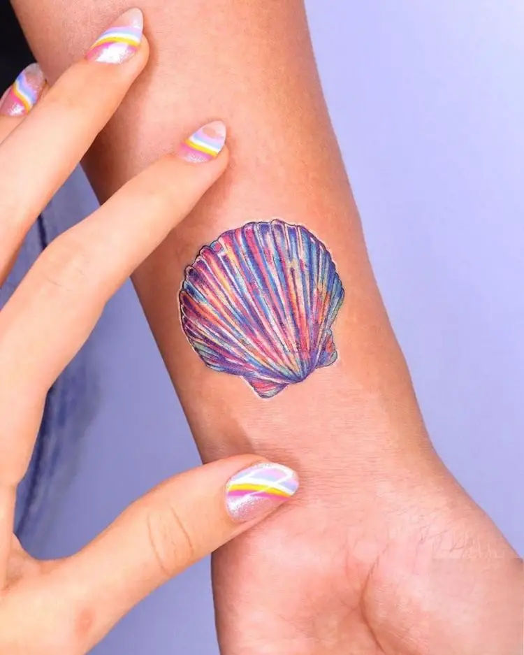This holographic-style seashell is a micro tattoo masterpiece, filled with iridescent purples, blues, and pinks. It sits on the wrist and is a stylish cognizance of the sea, being artistic and trendy at the same time. Perfect for those who want a simple but colorful beach symbol with a fun flair.