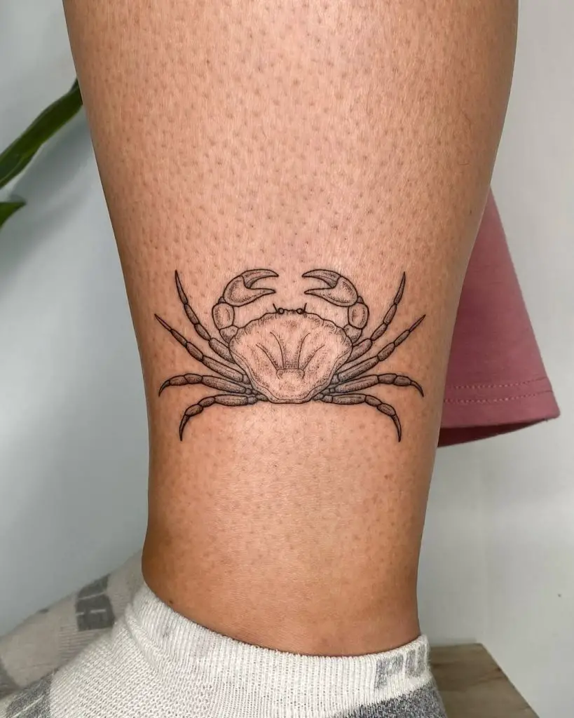 This clean-lined crab design is perfect for a leg tattoo with a subtle beach vibe. The anatomical but wonderful detailing is one that lovers of marine life will appreciate. It’s minimalist in execution but bold enough to stand alone, offering a unique ocean motif that’s timeless and nature-connected.