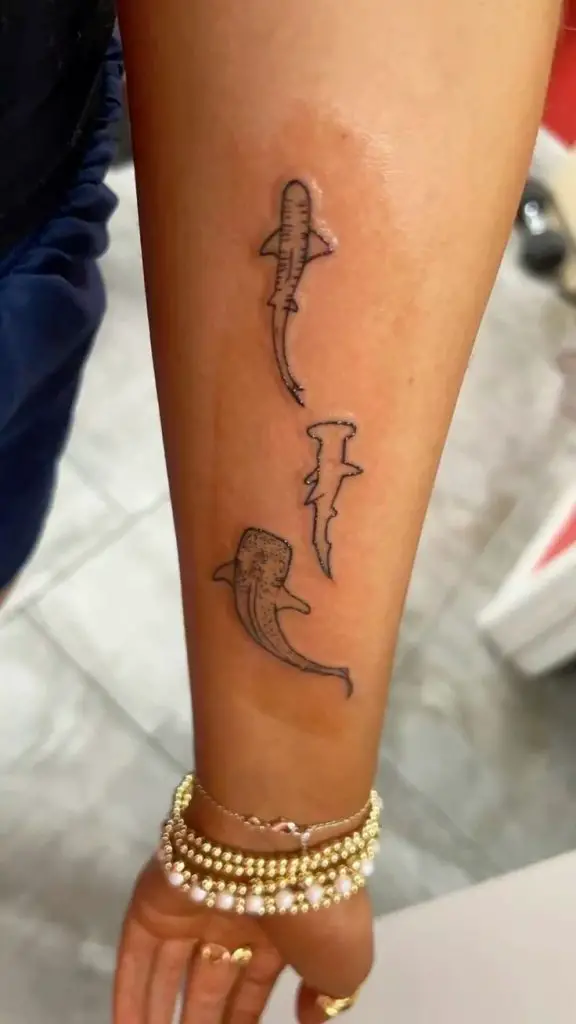 Three different shark silhouettes — including a hammerhead — swim vertically along the inner forearm. A strokes of fine detail The piece appears minimal and at the same time edgy, depicting strength, flow and power of the ocean. It’s a great tattoo for women who love marine creatures and want something sharp and simple.