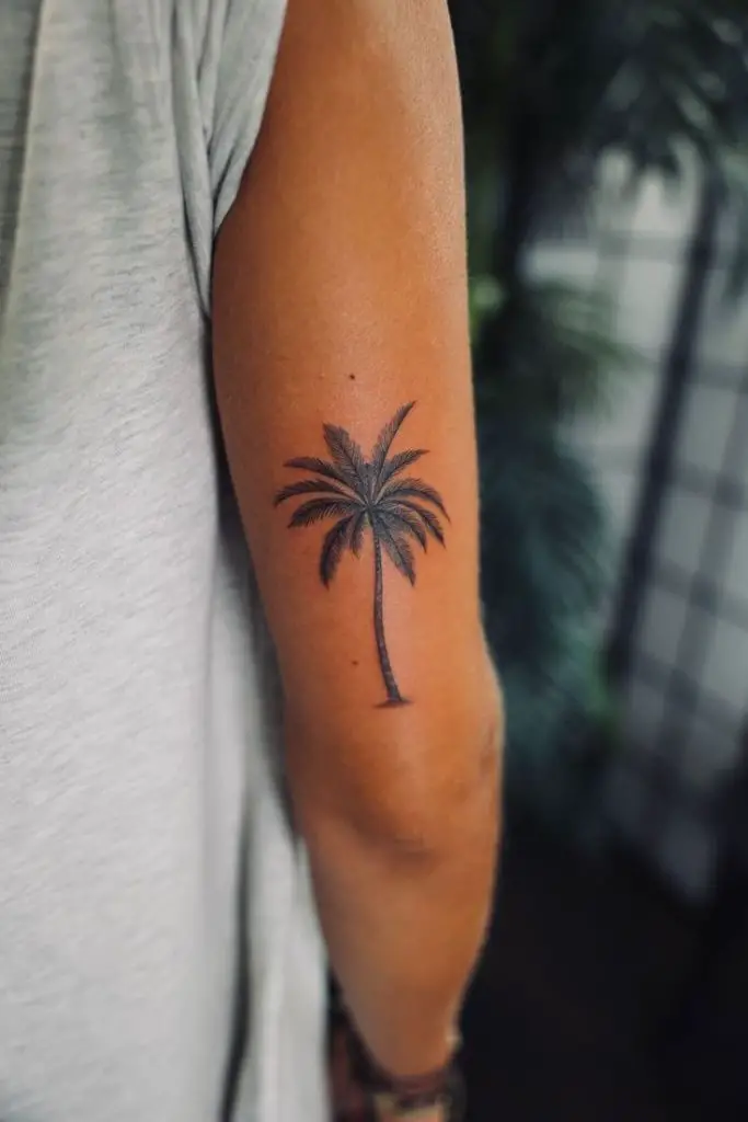 This shaded palm tree tattoo sits on the back of the upper arm, tall and elegant. It has an elegant tropical attitude in its smooth gradient shading, yet it is subtle. Great for a minimal forearm or shoulder look, it’s one of the most iconic tropical silhouettes in tattoo form.