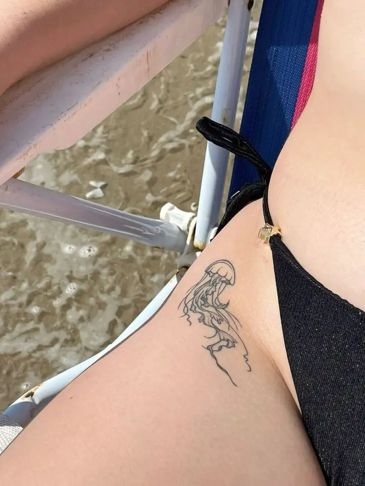 This fine-lined jellyfish tattoo flows gently along the hip, mimicking the movement of water and tentacles with a graceful touch. Its placement makes it both intimate and aquatic, ideal for women who want a rib or thigh tattoo that reflects freedom, mystery, and fluidity — like the sea itself.