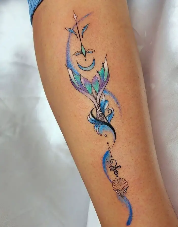 Blending fantasy with beach symbolism, this colorful tattoo swirls across the leg with a mermaid tail, seashell, crescent moon, and water-inspired brushstrokes. The lavender and blue colors make it have a particular softness of the watercolor series, and the clear black details make it have a structure and elegance. It’s a dreamlike design that evokes the spirit of the sea and would make a showstopping sleeve color or large vertical spine piece for adventurous beach lovers who live with their heads in the clouds and feet in the sand.