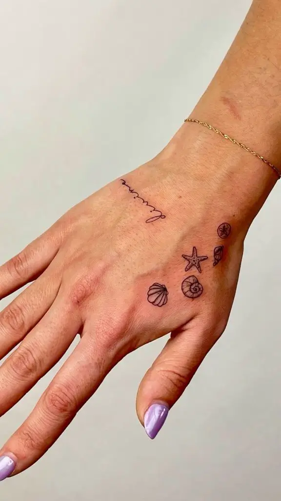 This tattoo turns the hand into a beach canvas — tiny seashells, a starfish, and a mini conch are arranged with effortless precision around the knuckles and side of the palm. It is a contemporary twist on micro tattoos, where the result is an adorable method to have your affection to the ocean literally on display. A single cursive word running down the side of the hand ties the whole composition together, perfect for women who love their ink delicate, intentional, and close to the pulse.