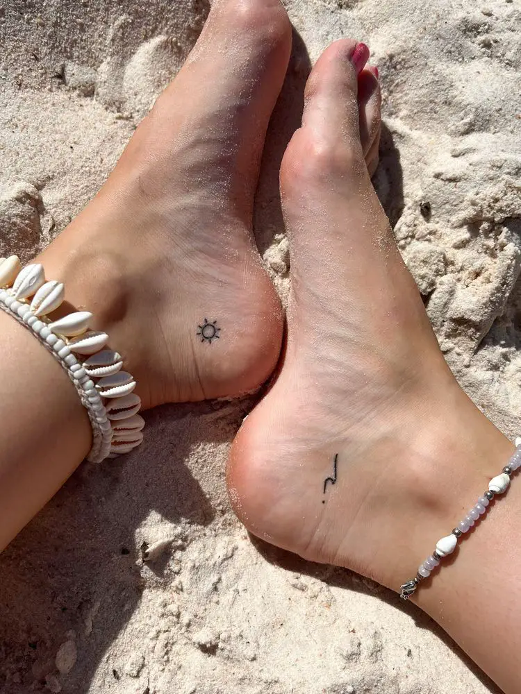 Set against sun-drenched sand, these two ankle tattoos offer a whisper of the beach — one is a tiny sun, the other a playful wave symbol. These designs are ideal as gifts to best friends or sisters who love the sea because the simplistic strokes used and the accuracy of the scale is minimal. The anklet shells add to the island feel, so these small tattoos seem to be very much like the souvenirs of the never-ending summer. They’re also great conversation starters when you’re barefoot on the boardwalk.