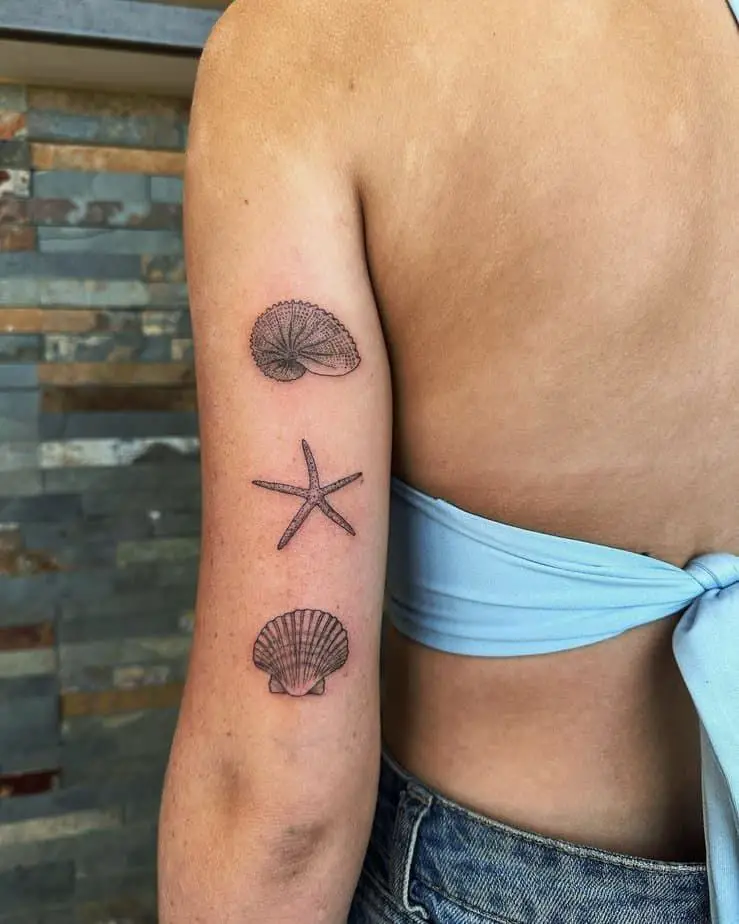 Etched on the arm just below the shoulder, this vertical arrangement features three realistic seaside treasures: a sand dollar, a starfish, and a scallop shell. The minute stippling as well as shaded detail causes each component to jump off the paper with texture and volume. This tattoo balances between the unusual and eternal which endows the lovers of the beach with a naturalistic design that exalts the tiny miracles of the shore of the water. It’s a great standalone piece or an anchor for a future beach-themed sleeve.
