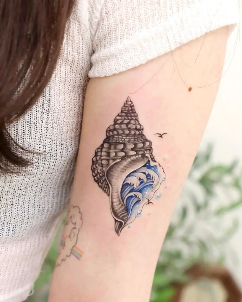 This colorful sleeve tattoo stands out with vibrant shades of blue pouring out of a realistic spiral shell. There is a miniature seascape at work inside, with waves rolling and roaring with color and dimension. This design is perfect for those who want a large arm piece that’s packed with artistry and symbolism — representing the sea’s constant motion and mystery.