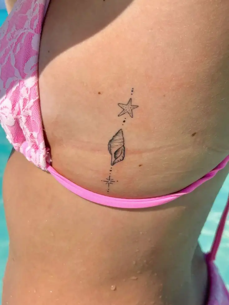 Running along the side of the ribcage, this fine line design features a vertically aligned starfish and seashell, dotted with celestial accents. It is discrete and elegant and will suit women with a taste of unostentatious ocean art. The placement hugs the body’s curves naturally, making it a stylish choice for swimwear or crop tops.