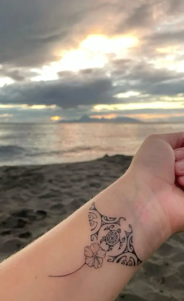 Photographed at the beach during a beautiful sunset, this intricate Polynesian-style wristband tattoo combines floral motifs with traditional tribal elements. It is not a tattoo but it is an ink bracelet that circles around a person like a piece of jewelry. A great option for those wanting to honor island cultures while making a delicate arm statement.