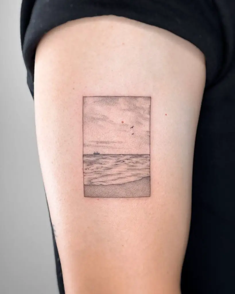 This fine line tattoo frames a tranquil seascape with a hazy sky and distant waves. It is an image of the idea of freedom and wanderlust in the two small birds that are spread in the air. Its rectangular shape feels like a memory frozen in time, making it an ideal minimalist forearm or upper arm piece for dreamers.
