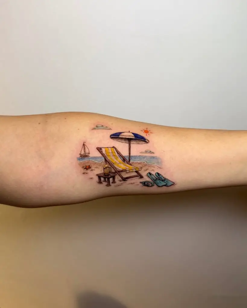 This vibrant watercolor beach tattoo shows a beach chair under a parasol, with flip-flops, a cocktail, and a sailboat in the background. Vibrant, full of colour and elaborate storytelling, this is the one to choose when you like detailed storytelling tattoos. Perfect for the inner bicep, it’s a standout piece for anyone wanting a splash of personality and fun.