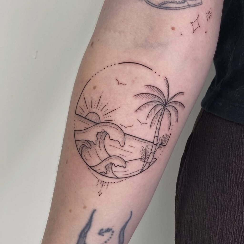 A palm tree, ocean waves, and a setting sun are captured in fine lines and dots in this rounded landscape tattoo. It is a dreamy tattoo on the shoulders or the arm with symmetric balance and simplified execution catching the peace of the beach night. It’s a prime choice for lovers of simple sleeve linework.