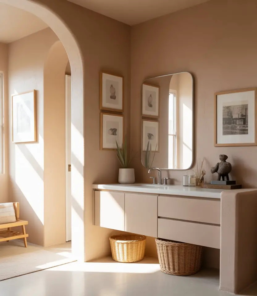 In fresh bathroom decor ideas for 2026, the wall is no longer left bare or treated as an afterthought. Decorative mirrors, framed prints, and sculptural accents turn the bathroom into a styled space rather than a utility zone. When the overall look stays visually clean, wall decor adds depth without overwhelming the space, especially in bathrooms with neutral finishes.