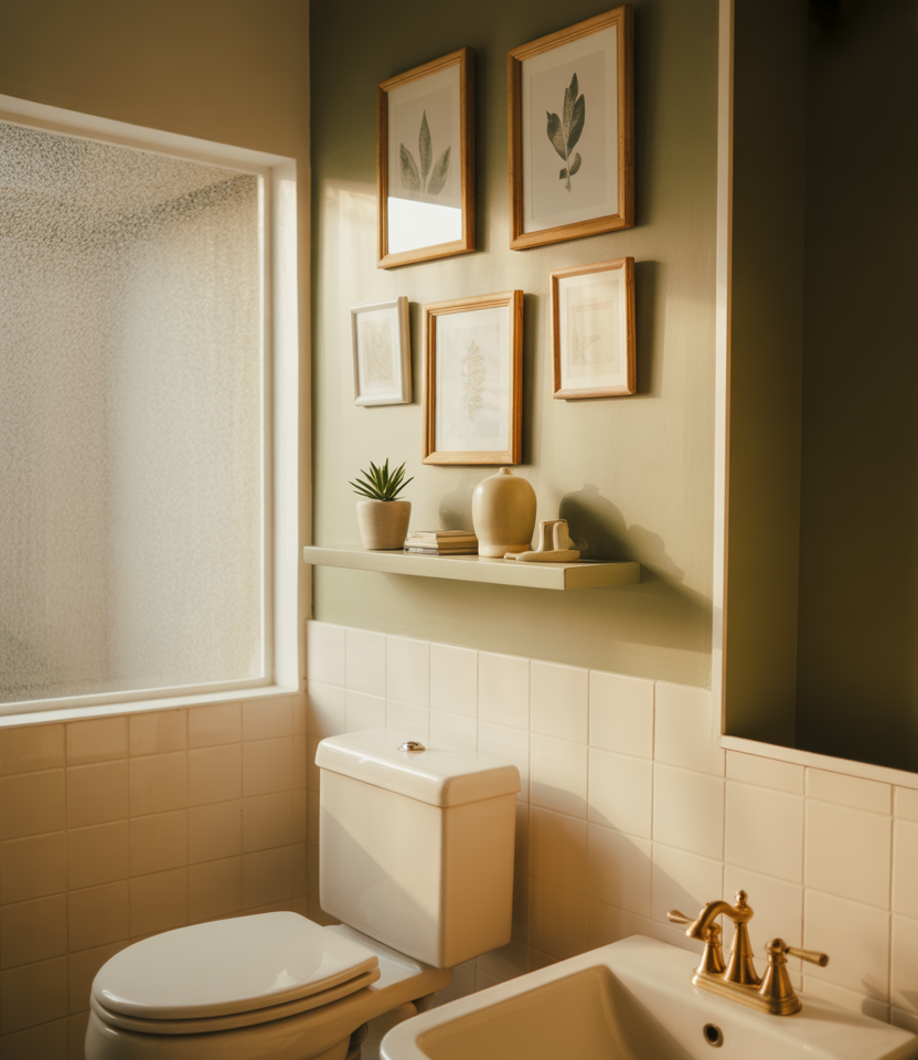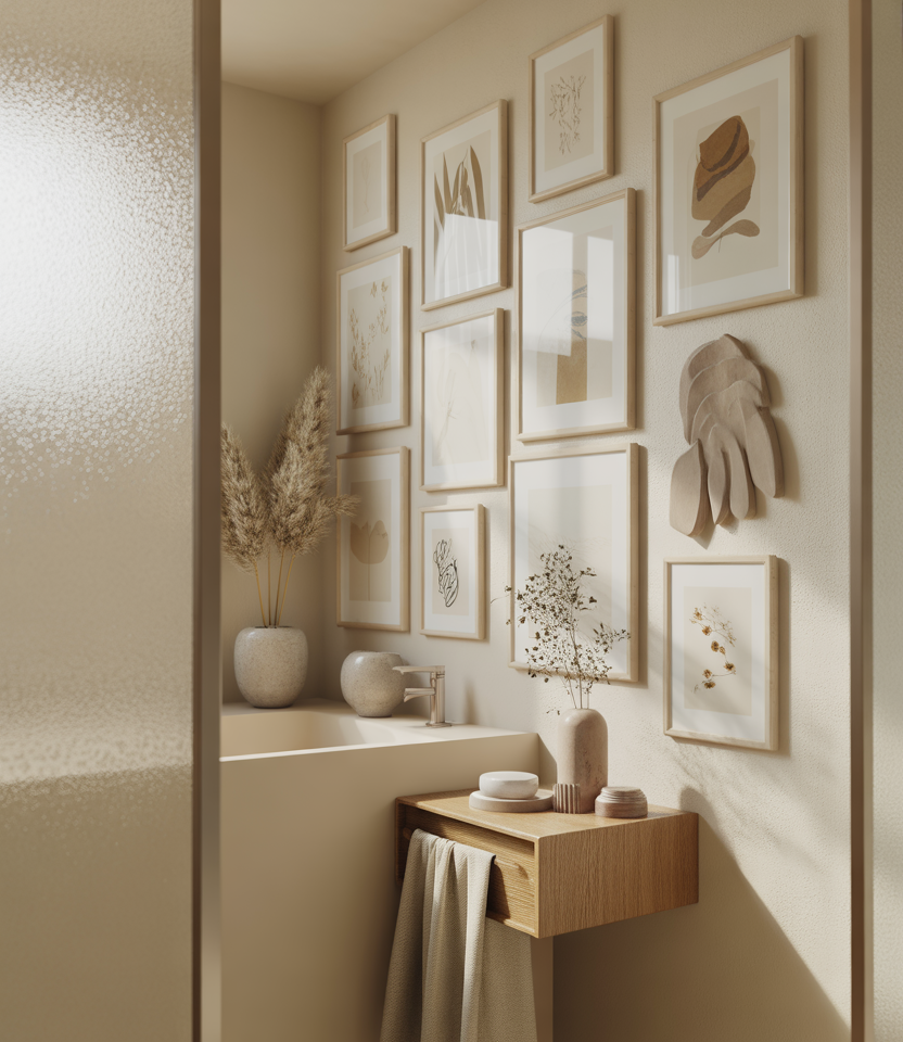 Where this works best is in bathrooms that lack architectural interest. Thoughtful wall decor can instantly add character to builder-grade spaces without changing fixtures or finishes.