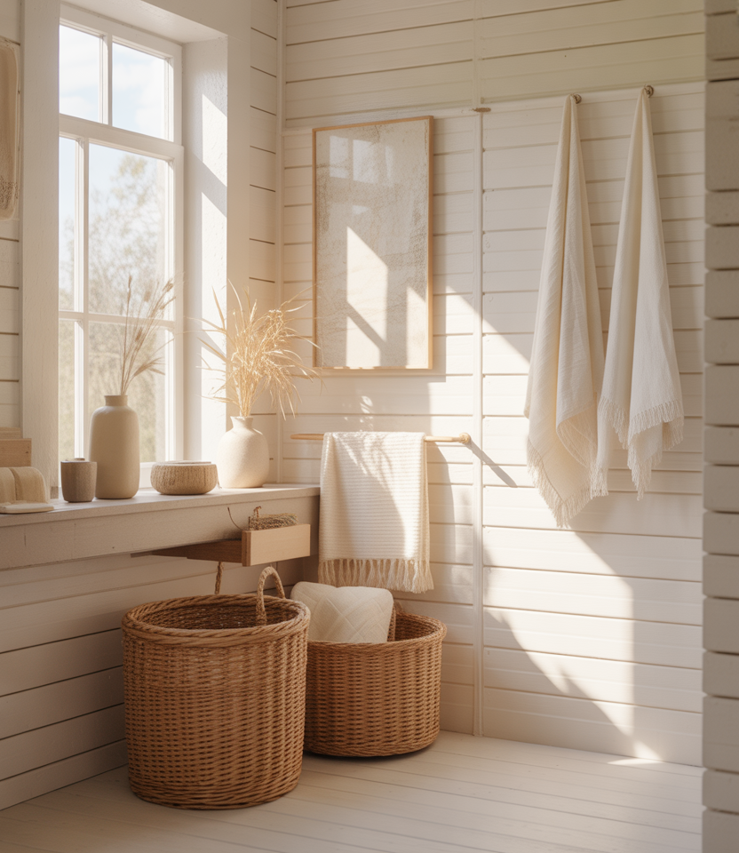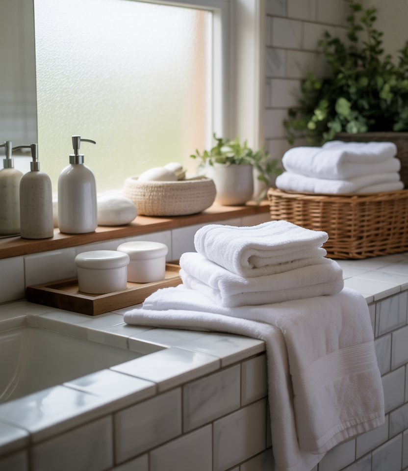 In fresh bathroom decor ideas for 2026, layering white decor is all about subtle contrast rather than matching tones. Soft towels, ceramic accessories, and textured objects add depth while keeping the room visually light. White decor works especially well when combined with natural materials that prevent the space from feeling flat or sterile.