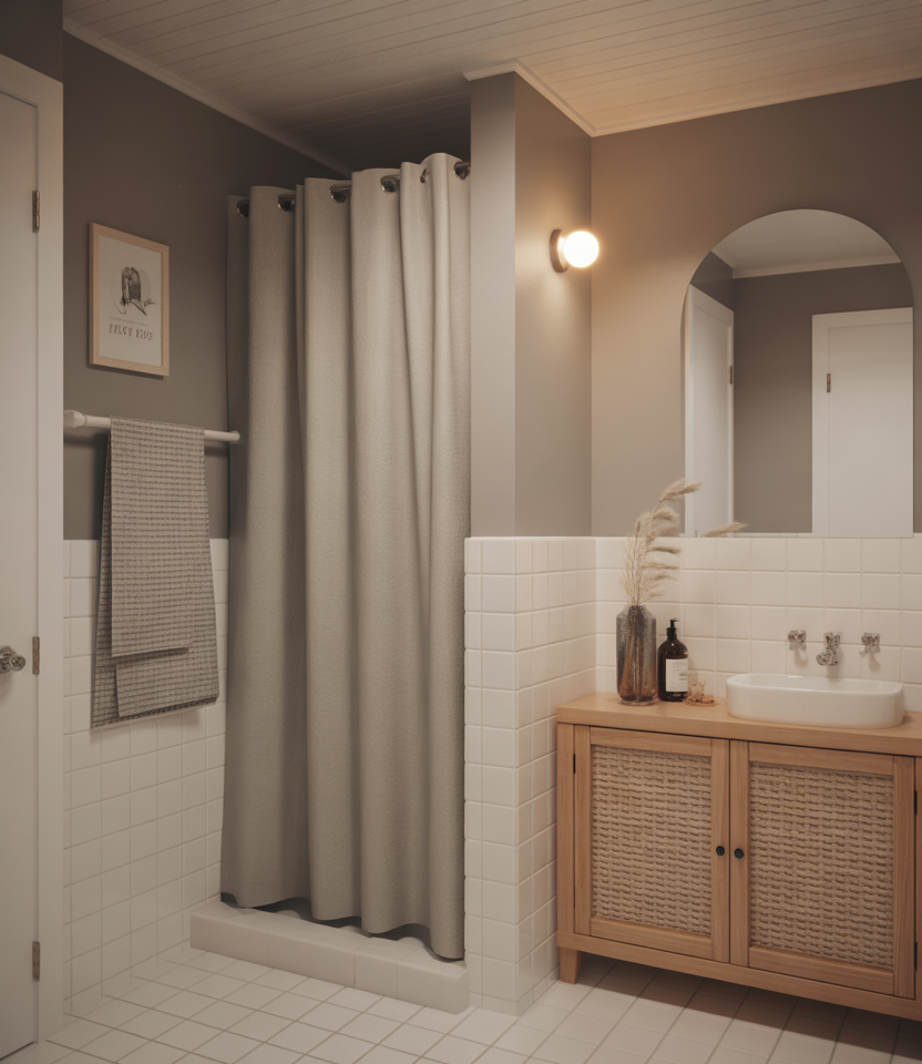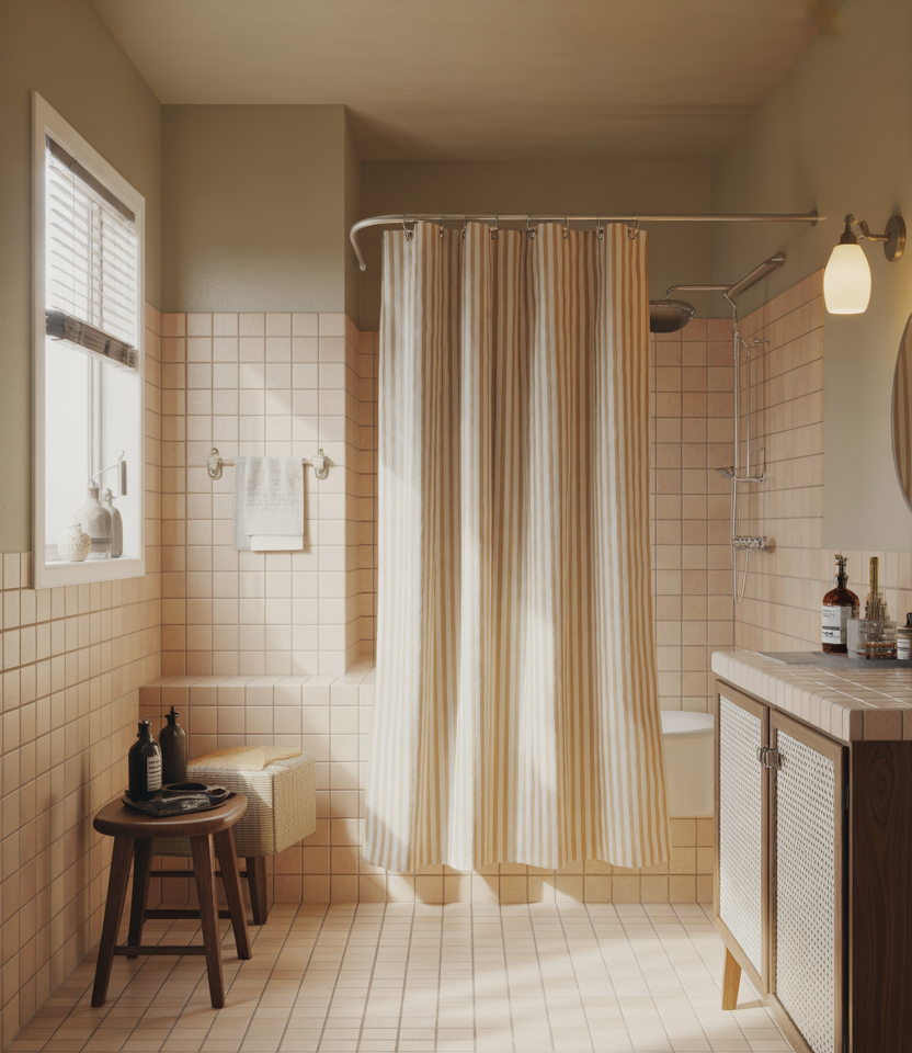 In fresh bathroom decor ideas for 2026, the shower curtain is treated as a textile statement rather than a background item. Textured fabrics, subtle patterns, and layered tones help define the entire room. When paired with a visually clean palette, a well-chosen curtain adds softness and movement without changing any permanent elements.