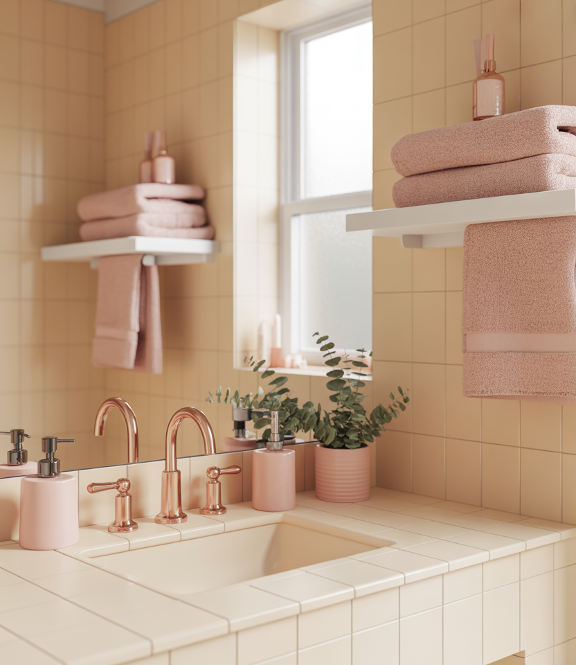 Where this works best is in bathrooms that feel visually cold. Pink decor adds warmth without sacrificing sophistication.