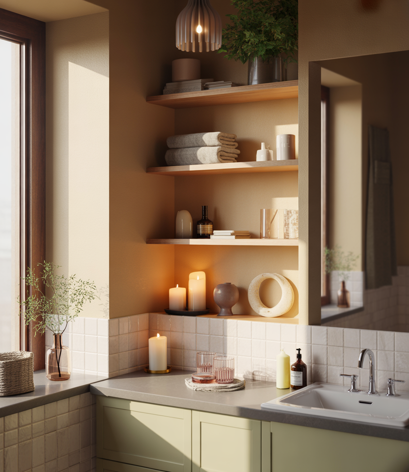 Open shelf styling has evolved into a key decor moment rather than simple storage. In 2026, bathrooms use shelves to display candles, folded towels, ceramics, and small plants that feel intentional. This approach brings warmth and texture while keeping everyday items visible but visually organized.