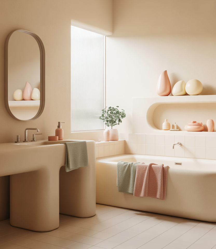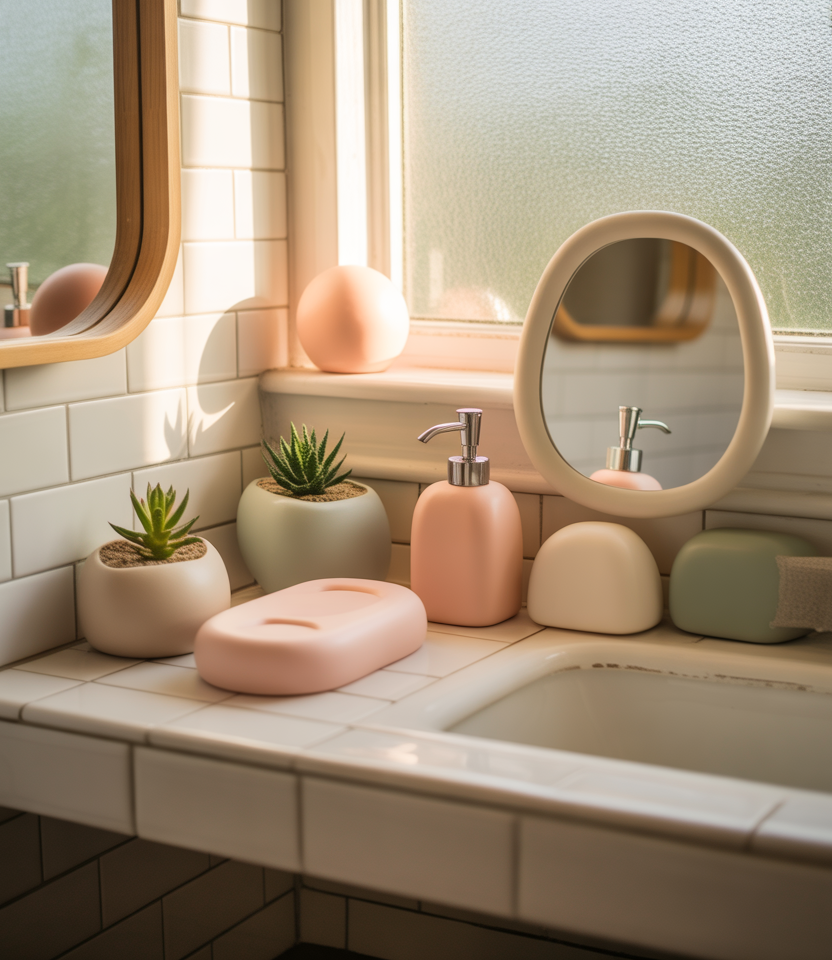 Inspired by Toca Boca, playful bathroom decor in 2026 focuses on color and shape while staying restrained. Rounded accessories and cheerful tones sit against a simple backdrop, creating a balanced and modern aesthetic.