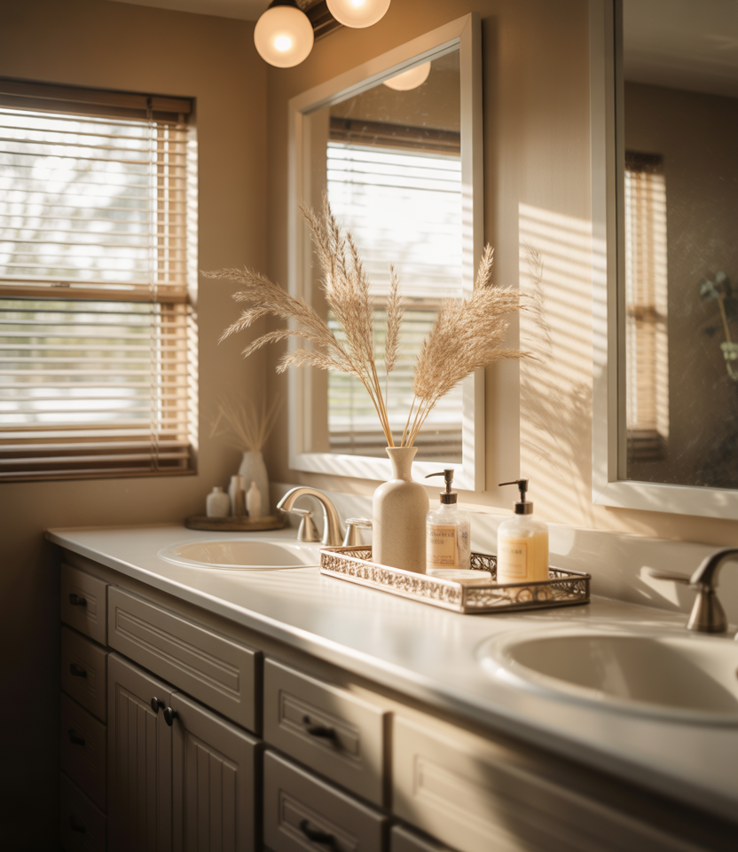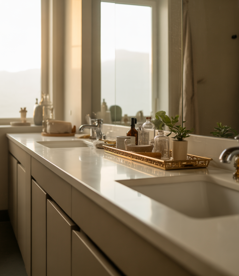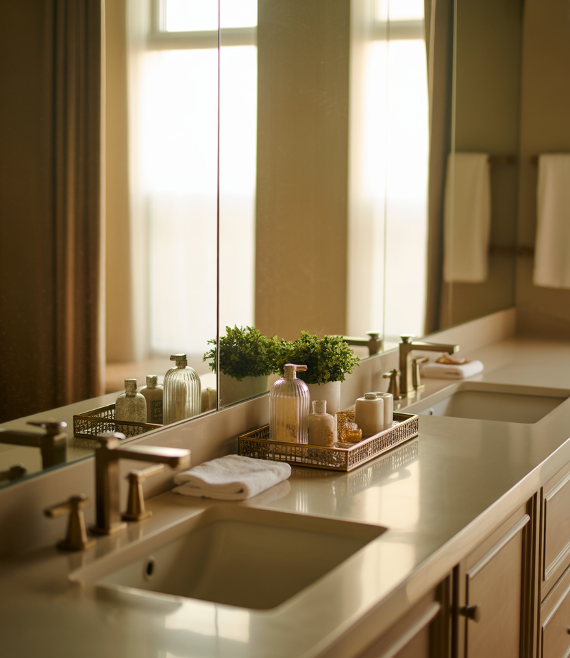 The area around the sink has become a focal point in bathroom decor. Trays, soap bottles, and small objects create rhythm and balance, especially on a long counter with a one-sink setup. When paired with a simple aesthetic, sink decor feels calm rather than crowded.