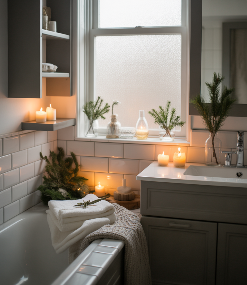 Bathroom Christmas decor in 2026 is understated and cozy. Small seasonal touches like greenery, candles, and soft textiles layer naturally over a grey and white base. The decor feels festive without overpowering the everyday style of the bathroom.