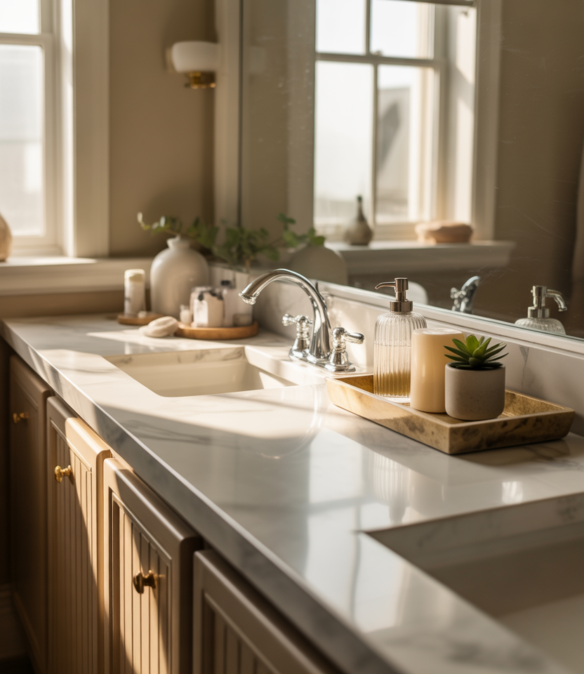 Designers often suggest grouping items in odd numbers to avoid a stiff look. This small styling trick makes sink decor feel relaxed and lived-in.