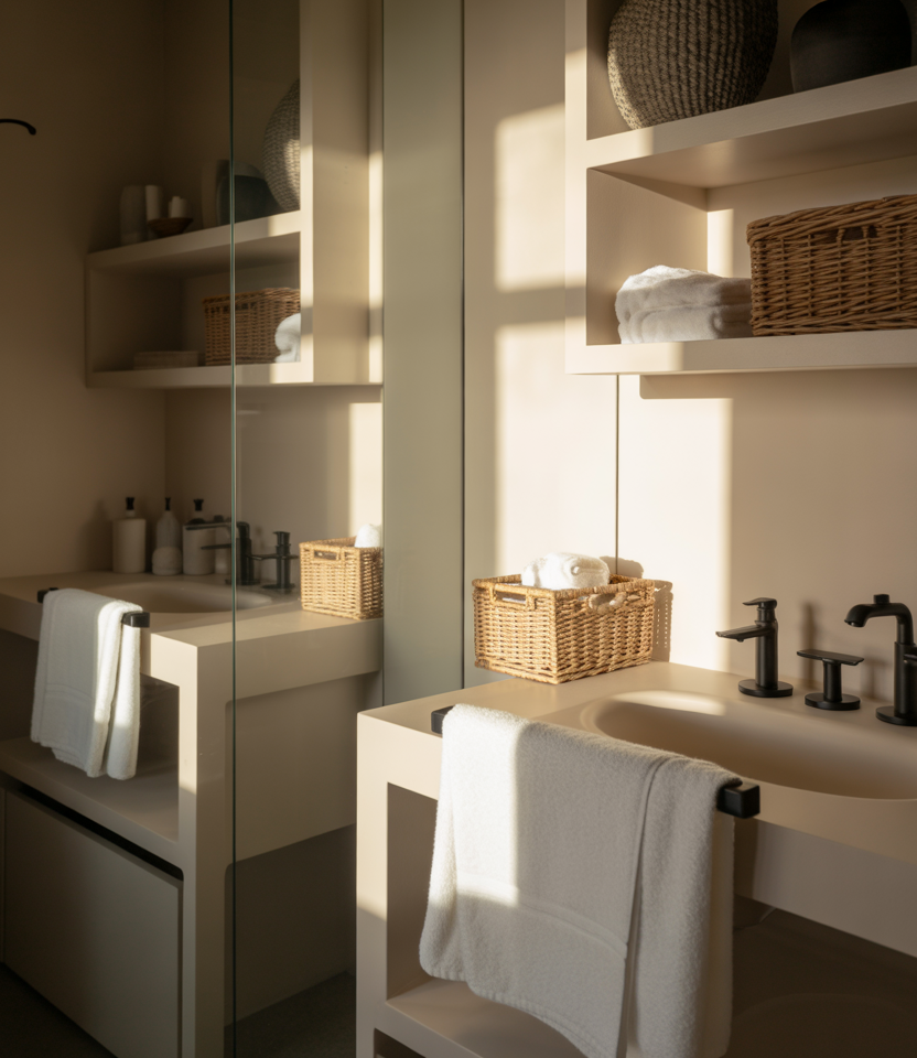 Where this works best is in shared bathrooms. A longer counter allows decor to coexist with everyday items without creating visual clutter.