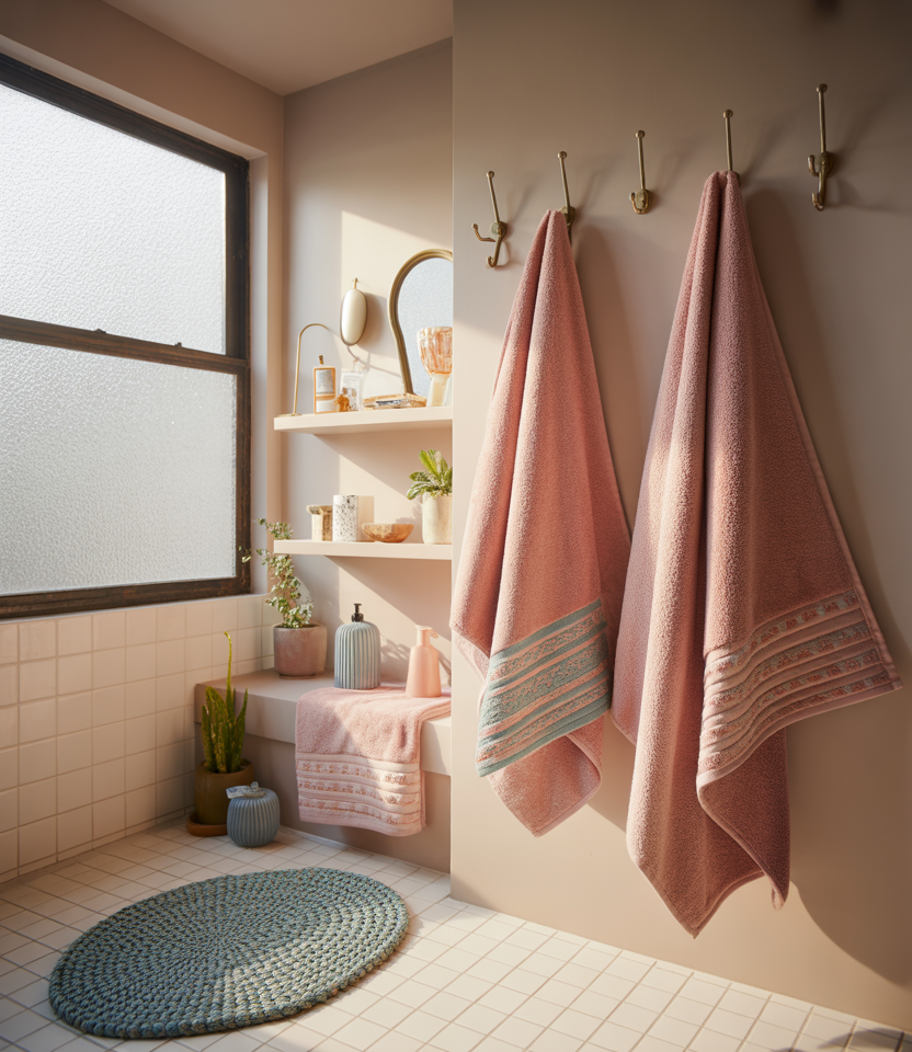 In an apartment, decor does the heavy lifting. Soft pink and blue accents appear through towels, rugs, and accessories rather than paint. This approach keeps rental bathrooms flexible while adding warmth and personality.